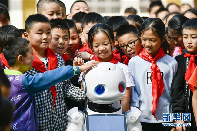9月2日,在城口縣蓼子鄉(xiāng)第一中心小學開學典禮上,機器人老師在和孩子進行互動交流。 新華社記者 劉潺 攝