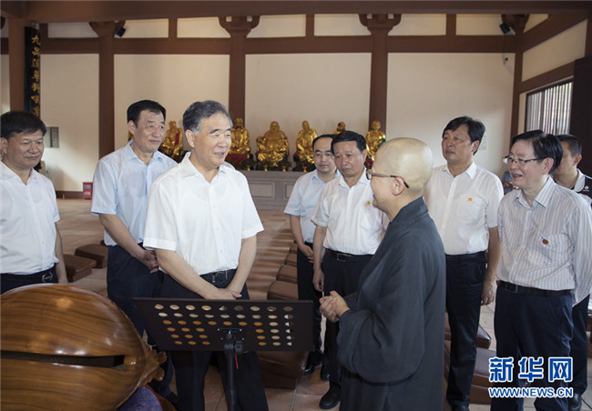 9月9日至10日,中共中央政治局常委、全國政協(xié)主席汪洋在江西調(diào)研宗教工作。這是9月9日,汪洋在宜黃縣曹山寶積寺與僧人交流。新華社記者 王曄 攝