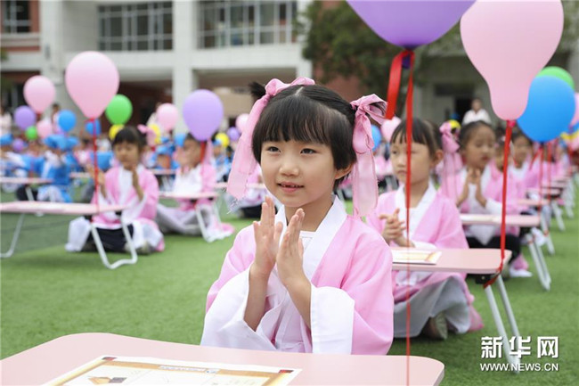 2019年9月10日,甘肅省蘭州市華僑實(shí)驗(yàn)學(xué)校為一年級(jí)新生舉辦“開筆禮”儀式,讓孩子們體驗(yàn)傳統(tǒng)文化,迎接新的學(xué)習(xí)生涯。