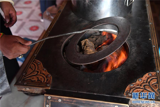 在青海省玉樹(shù)藏族自治州治多縣治渠鄉(xiāng)同卡村,村民布沙措江卓瑪給家中的爐子添加燃料——牛糞(9月12日攝)。在當(dāng)?shù)?,清潔環(huán)保的牛糞依然是不少牧民選用的主要燃料。新華社記者孫瑞博攝