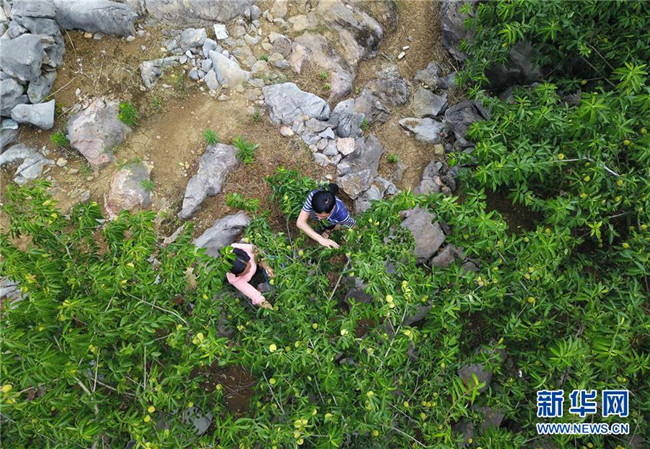 農(nóng)民在貴州省印江縣朗溪鎮(zhèn)昔蒲村的石漠化治理區(qū)采摘桃子(6月26日無人機(jī)拍攝)。 近年來,貴州省圍繞產(chǎn)業(yè)選擇、培訓(xùn)農(nóng)民、技術(shù)服務(wù)、資金籌措、組織方式、產(chǎn)銷對接、利益聯(lián)結(jié)、基層黨建等“八要素”,通過“減、融、服”創(chuàng)新推進(jìn)農(nóng)村產(chǎn)業(yè)結(jié)構(gòu)調(diào)整,既帶動了農(nóng)戶增收,也推動了特色產(chǎn)業(yè)做大做強(qiáng)。 新華社記者 楊文斌 攝