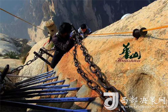 長空棧道位于華山南峰東側山腰,是華山派第一代宗師元代高道賀志真為遠離塵世靜修成仙,在萬仞絕壁上鑲嵌石釘搭木椽而筑。棧道上下皆是懸崖絕壁,鐵索橫懸,由條石搭成尺許路面,下由石柱固定,游人至此,面壁貼腹,屏氣挪步,被譽為“華山第一天險”。由于棧道險峻,故當地人有“小心九厘三分,要尋尸首,洛南商州”之說。這里只是探險之道,并非登山必由之路,膽小人就在升表臺看看也就行了。所以石刻上不少警告之語:“懸崖勒馬”等。(供稿:華旅集團營銷中心)