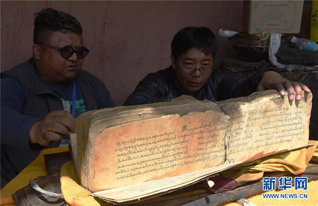 在西藏日喀則市定日縣倫措寺,西藏自治區(qū)古籍保護(hù)中心古籍專家在查看古籍文獻(xiàn)(資料照片)。新華社記者春拉攝
