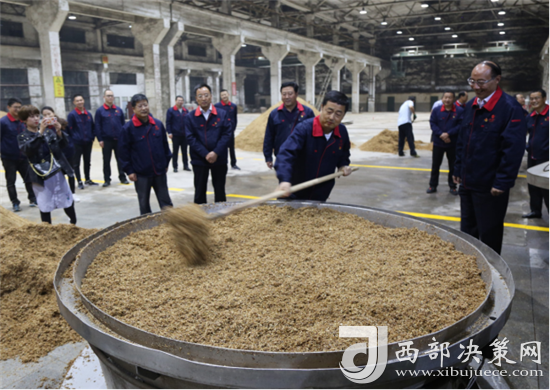 西鳳集團(tuán)公司領(lǐng)導(dǎo)班子成員還詳細(xì)查看了窖池發(fā)酵情況,現(xiàn)場和工人師傅們一起裝甑餾酒,為大家鼓勁加油!