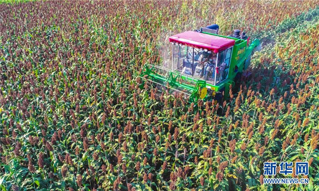 10月7日,在棗強縣肖張鎮(zhèn)西趙莊村,村民使用收割機收割高粱(無人機拍攝)。新華社記者 李曉果 攝