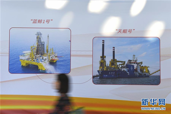 10月15日,與會(huì)者經(jīng)過(guò)“藍(lán)鯨1號(hào)”鉆井平臺(tái)與“天鯤號(hào)”自航絞吸挖泥船展板。 新華社記者毛思倩攝