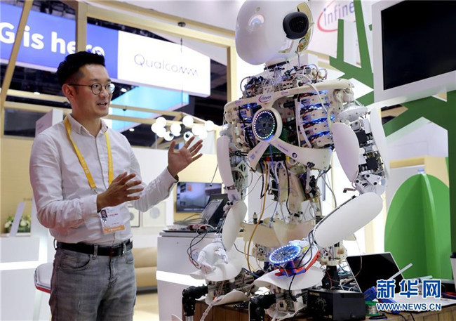 11月3日,科技生活展區(qū)的德國英飛凌公司的機(jī)器人Roboy已完成調(diào)試,它將在展會(huì)上和觀眾進(jìn)行多項(xiàng)有趣互動(dòng)。新華社記者劉穎攝