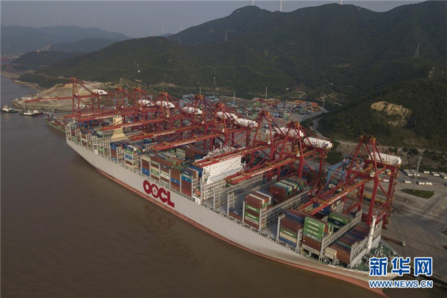 一艘貨輪??吭趯幉ㄖ凵礁鄞┥礁蹍^(qū)集裝箱碼頭(2018年6月13日無人機(jī)拍攝)。新華社記者 黃宗治 攝