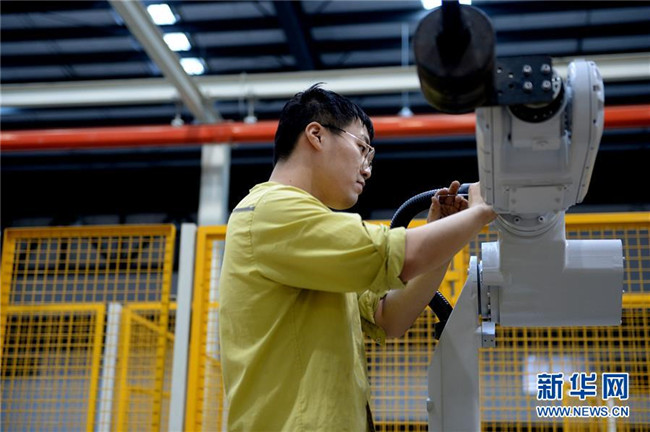 在蕪湖機(jī)器人產(chǎn)業(yè)園,工作人員在預(yù)裝埃夫特六關(guān)節(jié)機(jī)器人零部件(10月21日攝)。  新華社發(fā)(黃博涵攝)