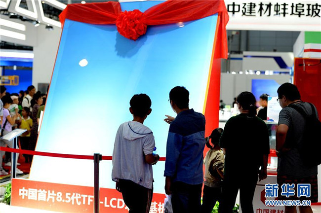 觀眾在2019世界制造業(yè)大會上參觀中國首片8.5代TFT-LCD玻璃基板(9月22日攝)。  新華社發(fā)(黃博涵攝)
