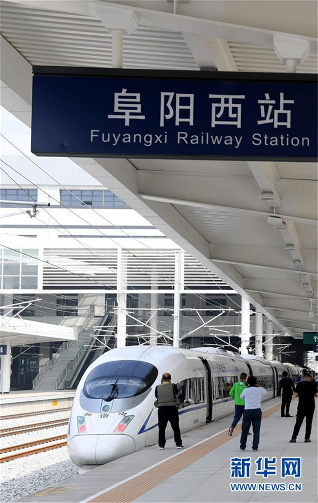 10月24日,一輛試運(yùn)行列車停靠在商合杭高鐵阜陽西站。  新華社記者劉軍喜攝