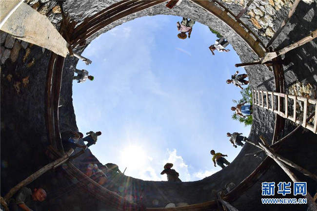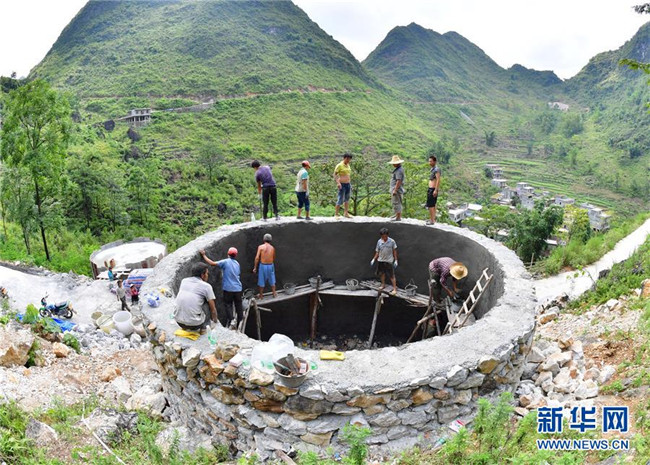 在廣西大化瑤族自治縣板升鄉(xiāng)弄勇村,群眾在修建家庭水柜(2017年9月2日攝)。 新華社記者 黃孝邦 攝