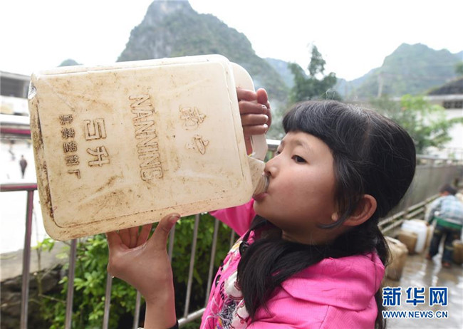 在廣西大化瑤族自治縣板升鄉(xiāng)八好小學(xué),一名學(xué)生喝水桶里的雨水(2014年11月24日攝)。八好小學(xué)有400多名學(xué)生,曾僅有一個不足100立方米的水柜,用于收集儲存樓頂?shù)挠晁?,學(xué)生需定期定量用水。遇到長時間不下雨,學(xué)校需要到鄉(xiāng)政府所在地運(yùn)水。如今,學(xué)校修建了5個大水柜,并從兩公里外引泉水到校園,飲水難問題得到解決。 新華社記者 黃孝邦 攝