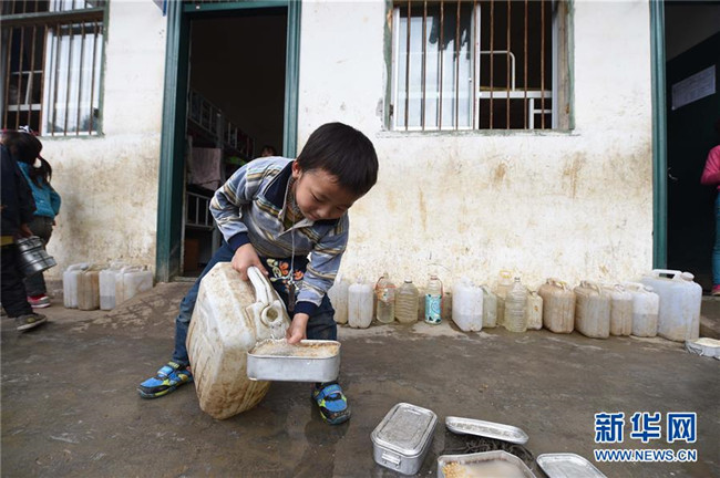 在廣西大化瑤族自治縣板升鄉(xiāng)八好小學(xué),一名學(xué)生用儲備在水桶里的雨水淘米煮飯(2014年11月24日攝)。八好小學(xué)有400多名學(xué)生,曾僅有一個不足100立方米的水柜,用于收集儲存樓頂?shù)挠晁?,學(xué)生需定期定量用水。遇到長時間不下雨,學(xué)校需要到鄉(xiāng)政府所在地運(yùn)水。如今,學(xué)校修建了5個大水柜,并從兩公里外引泉水到校園,“飲水難”問題得到解決。 新華社記者 黃孝邦 攝