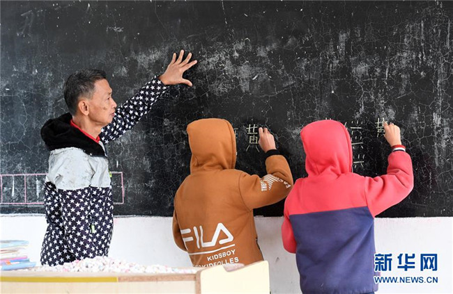 11月19日,在廣西上思縣那琴鄉(xiāng)中心小學(xué)逢通村教學(xué)點(diǎn),梁志雄教兩名學(xué)生寫(xiě)字。新華社記者陸波岸攝