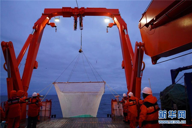 “雪龍2”號(hào)12月7日離開(kāi)南大洋普里茲灣海域向西航行,開(kāi)始對(duì)宇航員海海域展開(kāi)科考作業(yè)??瓶缄?duì)員沿著本次宇航員海科考的首個(gè)調(diào)查斷面,自北向南做了多個(gè)站位的CTD(海水溫鹽深測(cè)量?jī)x)采水作業(yè)、浮游生物垂直拖網(wǎng)作業(yè),以及魚(yú)類拖網(wǎng)和箱式采樣器等采樣作業(yè)。