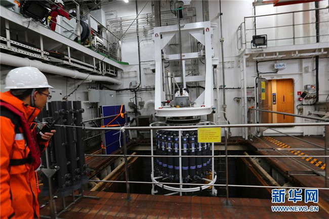 12月9日,科考隊(duì)員首次利用“雪龍2”號(hào)月池系統(tǒng)進(jìn)行CTD采水作業(yè)。  新華社記者 劉詩(shī)平 攝