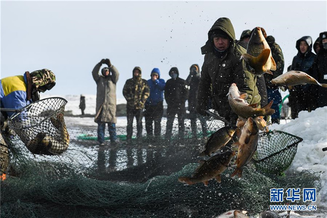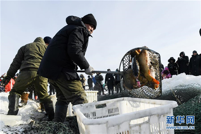 12月18日,工作人員將冬捕魚(yú)打撈上岸。 新華社記者 劉磊 攝