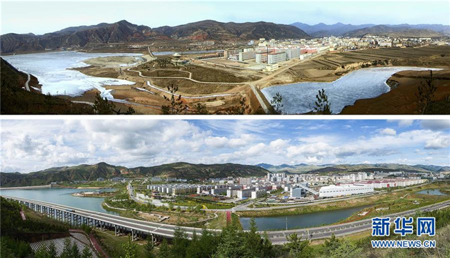 拼版照片:上圖為2009年1月30日拍攝的寧夏固原市隆德縣境內的渝河景象;下圖為經過流域綜合治理后的渝河(2018年5月19日攝)。 新華社發(fā)(李玉 攝)