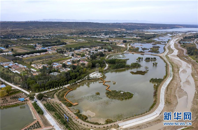 寧夏固原市原州區(qū)境內的清水河流域在進行防洪加固和人工濕地工程建設(10月10日無人機拍攝)。 新華社記者 馮開華 攝