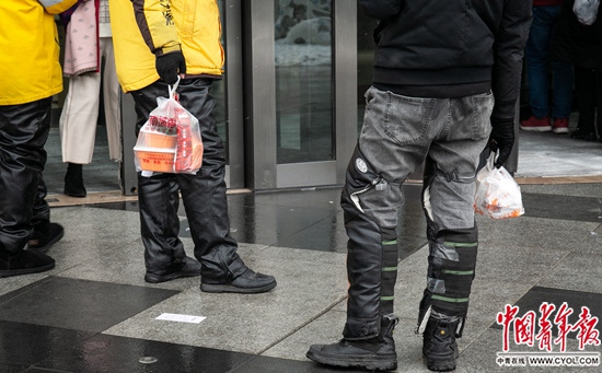 12月16日,北京通州區(qū)萬(wàn)達(dá)寫(xiě)字樓門(mén)口,兩位外賣(mài)員在等待顧客取餐。見(jiàn)習(xí)記者 張玉佳/攝