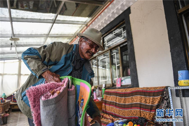 在西藏阿里地區(qū)札達(dá)縣托林鎮(zhèn)札布讓村,76歲的達(dá)瓦次仁在整理家庭旅館的床墊(7月30日攝)。 新華社記者 晉美多吉 攝