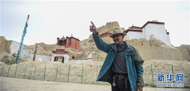 達(dá)瓦次仁和他曾經(jīng)居住的、位于古格遺址前的家(7月30日攝)。新華社記者 晉美多吉 攝