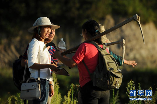 貴州省石阡縣坪山鄉(xiāng)大坪村監(jiān)委會(huì)主任左艷(左一)與下地勞作歸來的村民交談(2018年8月29日攝)。新華社記者 楊文斌 攝