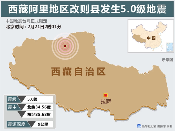 中國地震臺網正式測定:2月21日2時01分,在西藏阿里地區(qū)改則縣(北緯34.56度,東經85.68度)發(fā)生5.0級地震,震源深度9公里。
