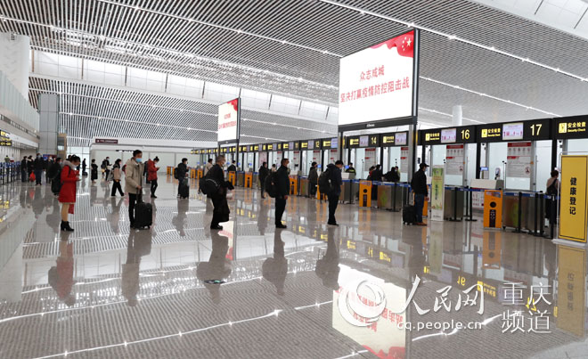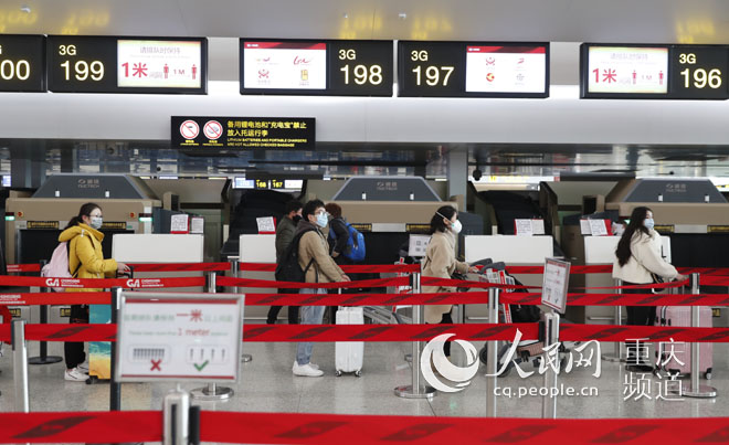 隨著旅客返程復工增多,重慶機場為最大限度減少人員聚集,通過自助值機、無紙化值機縮短旅客在候機樓停留時間同時,引導旅客在值機、安檢、登機排隊時,都保持1米以上的安全防護距離。