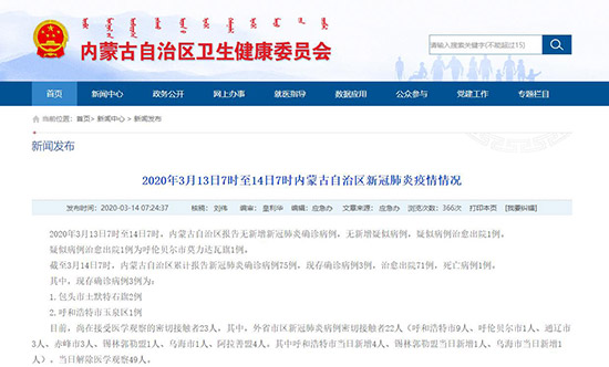 截至3月14日7時,內蒙古自治區(qū)累計報告新冠肺炎確診病例75例,現(xiàn)存確診病例3例,治愈出院71例,死亡病例1例。