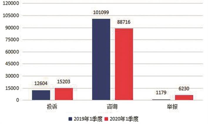 一季度,全省共受理消費(fèi)者投訴15203件,與2019年同期相比上升了20.6%。其中商品類投訴7635件,與2019年同期相比上升了39.3%,服務(wù)類投訴7568件,與2019年同期相比上升了6.3%。