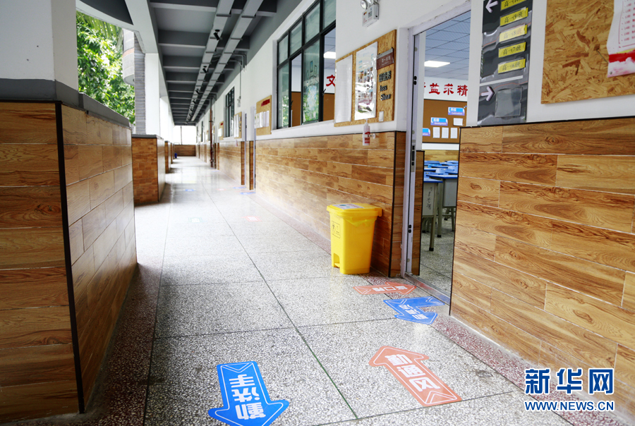 在重慶市第十一中學,為避免人流聚集,在公眾通道處學校設置了行進方向指示標識以引導師生。新華網(wǎng) 彭博攝