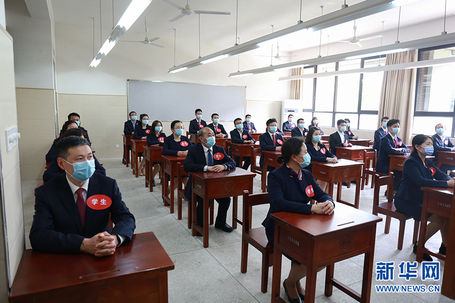 在重慶市第八中學教室內(nèi),學生座位保持了一定間距,學生單人單座,盡量避免上課期間相互接觸。圖為教師演練上課場景。新華網(wǎng)發(fā)