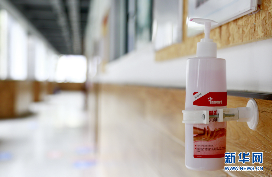 在教室、走廊、寢室等人流密集的場合,重慶市第十一中學配備了免洗消毒液供師生使用。新華網(wǎng) 彭博攝