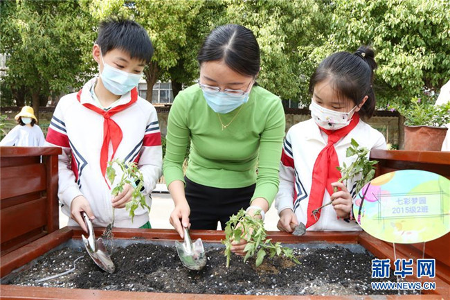4月29日,在安徽省合肥市臨泉路第二小學,學生在班級“責任田”里栽種農(nóng)作物幼苗。新華社發(fā)(傅軍 攝)
