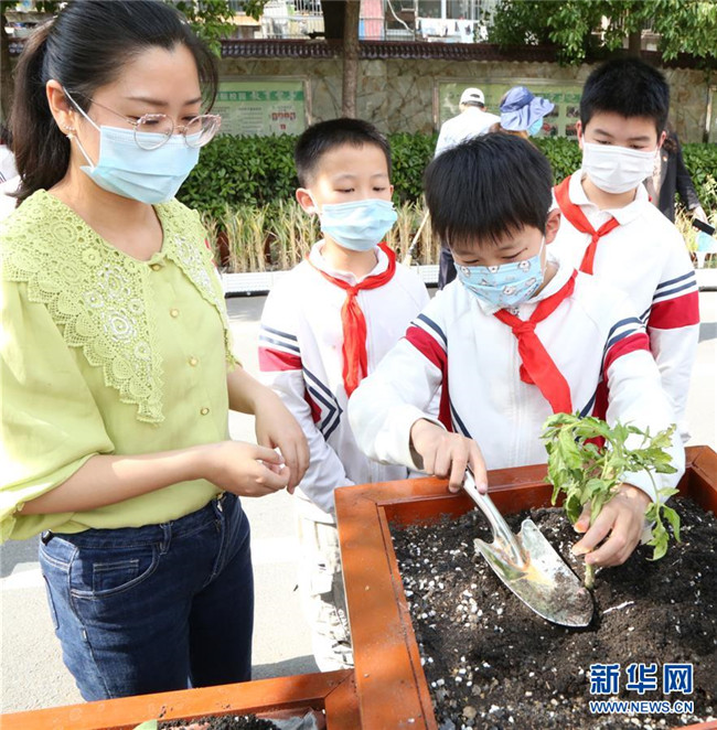 該校啟動“我是小小勞動者”系列線上和線下主題活動月。在線下活動中,先期復學的學生們在輔導老師指導下開展勞動實踐。