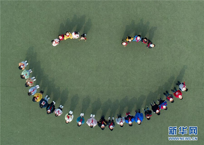 5月8日,江蘇省泰州市大馮中心小學學生在操場上拼出笑臉圖案(無人機照片)。 當日是世界微笑日。 新華社發(fā)(湯德宏 攝)