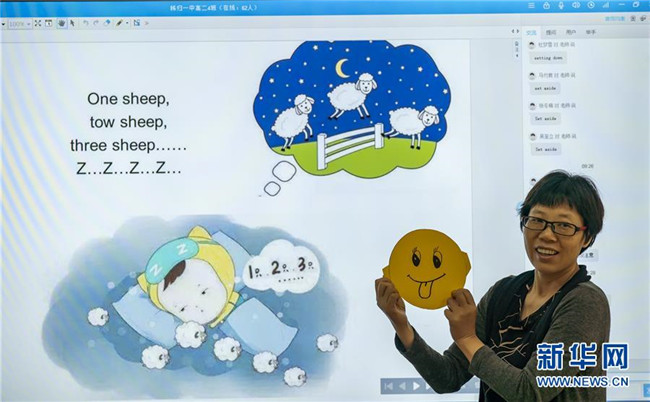 5月8日,在湖北省宜昌市秭歸縣第一中學,老師在上網課前手拿自制的笑臉卡與學生互動。 當日是世界微笑日。 新華社發(fā)(向紅梅 攝)