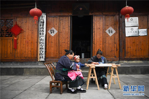 吳美金(右一)在十八洞村苗繡特產(chǎn)農(nóng)民專業(yè)合作社繡苗繡(4月24日攝)。1967年出生的吳美金,1992年嫁入飛蟲村(現(xiàn)十八洞村飛蟲寨)時(shí),只有爛泥路的飛蟲村不僅田土少,掙錢活路也少,生活十分困難。2014年,吳美金加入了十八洞村苗繡特產(chǎn)農(nóng)民專業(yè)合作社,從小就會(huì)的苗繡傳統(tǒng)手藝如今成了家庭增收的法寶,不僅在家門口就把錢掙了,同時(shí)還能照顧年幼的孫子孫女。“現(xiàn)在的日子,比年輕的時(shí)候好多了。”吳美金說。新華社記者薛宇舸攝