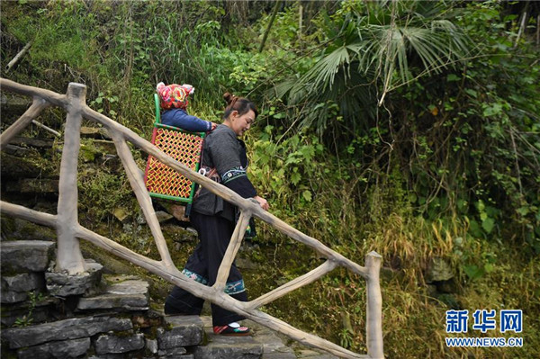 吳美金背著孫子走在十八洞村中,準(zhǔn)備前往村里的苗繡合作社(4月24日攝)。1967年出生的吳美金,1992年嫁入飛蟲村(現(xiàn)十八洞村飛蟲寨)時(shí),只有爛泥路的飛蟲村不僅田土少,掙錢活路也少,生活十分困難。2014年,吳美金加入了十八洞村苗繡特產(chǎn)農(nóng)民專業(yè)合作社,從小就會(huì)的苗繡傳統(tǒng)手藝如今成了家庭增收的法寶,不僅在家門口就把錢掙了,同時(shí)還能照顧年幼的孫子孫女。“現(xiàn)在的日子,比年輕的時(shí)候好多了。”吳美金說。新華社記者薛宇舸攝