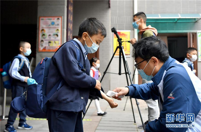 5月11日,陜西省西安市新城區(qū)后宰門小學的學生進校時測量體溫。新華社記者 劉瀟 攝