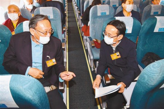 5月20日,全國政協(xié)委員、西藏人民醫(yī)院副院長格桑羅布(左)與全國政協(xié)委員、西藏大學(xué)科研處處長圖登克珠在前往北京途中就如何在全國兩會上建言獻(xiàn)策、履職盡責(zé)進(jìn)行交流。本報記者 旦增西旦 攝