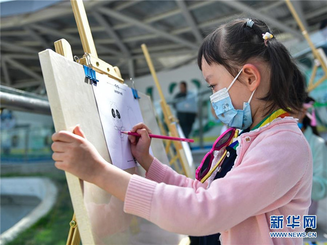5月31日,小朋友在西寧熊貓館內繪畫。 新華社記者 張龍 攝