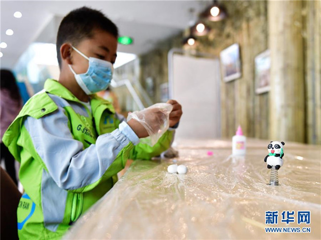 5月31日,小朋友在西寧熊貓館內制作熊貓擺件。 新華社記者 張龍 攝