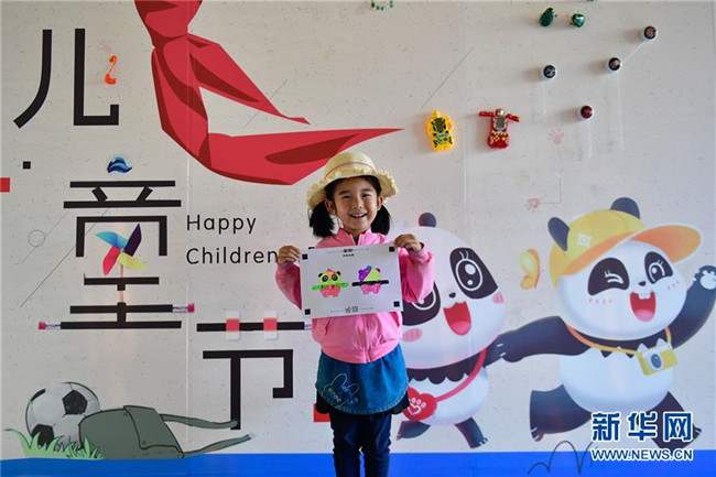 5月31日,一位小朋友在西寧熊貓館內展示自己的熊貓主題畫作。 新華社記者 張龍 攝