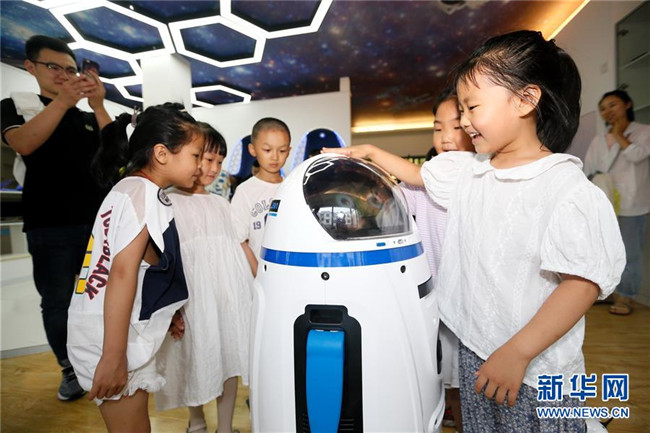 7月12日,小學(xué)生在山東省青島市即墨區(qū)環(huán)秀街道濱湖社區(qū)科普館與機器人互動。新華社發(fā)(梁孝鵬 攝)