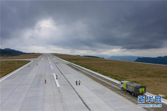 8月12日,校飛正式開始前一天,工作人員對(duì)仙女山機(jī)場(chǎng)跑道路面進(jìn)行清潔(無人機(jī)照片)。新華社記者 劉潺 攝
