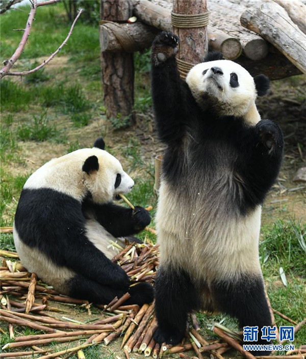 8月16日,大熊貓“奇果”(左)和“園滿”在西寧熊貓館內(nèi)玩耍。青海省西寧熊貓館的四只大熊貓已經(jīng)在西寧生活了一年多,在工作人員的悉心照顧下,已經(jīng)適應(yīng)了青藏高原的氣候,身體各項(xiàng)指標(biāo)正常。新華社記者薛玉斌攝