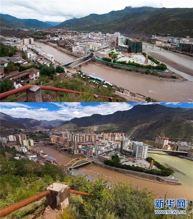 2010年拍攝的昌都市景色(上)和2020年拍攝的昌都市景色(拼版照片)。 新華社記者 普布扎西 攝